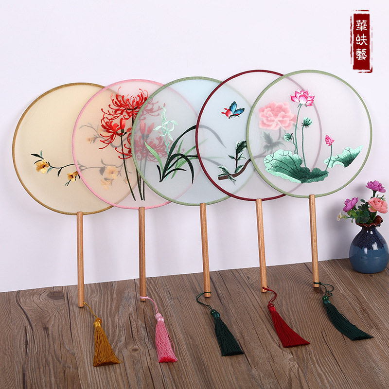 刺绣双面绣团扇古风长柄流苏圆形真丝女式汉服舞蹈扇子中国风宫扇