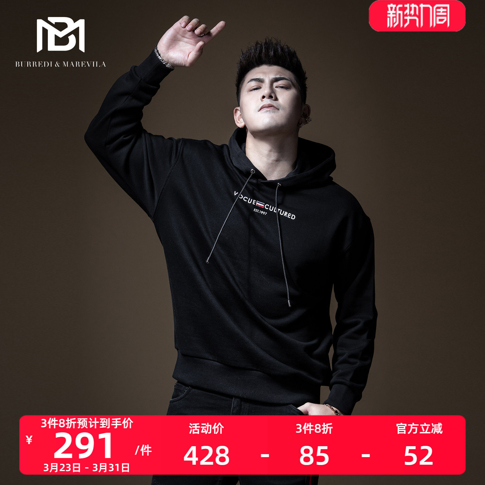 BM男士字母刺绣嘻哈卫衣男连帽ins潮牌港风潮流韩版百搭纯色外套