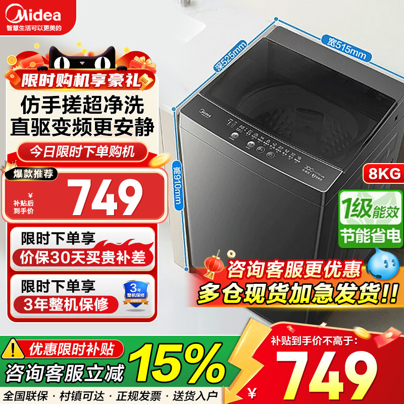 • 泡美丽»»美的8KG波轮洗衣机直驱变频全自动家用租房抗菌除螨洗脱一体56DT