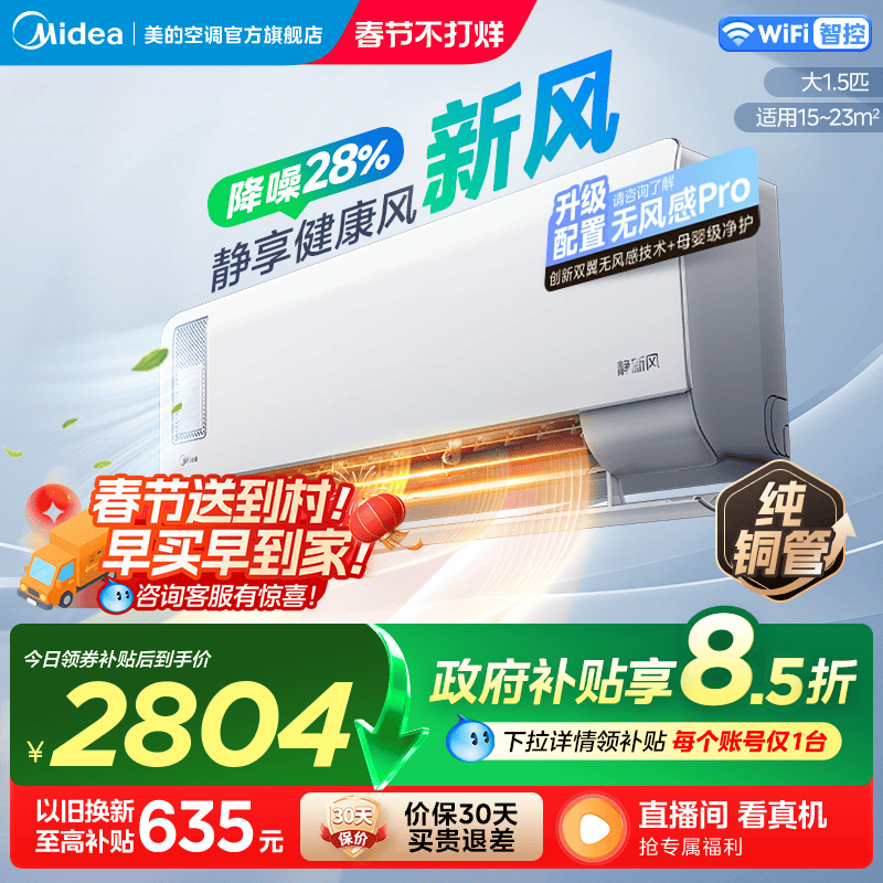 美的静新风空调1.5匹一级变频卧室家用挂机冷暖两用除湿自清洁