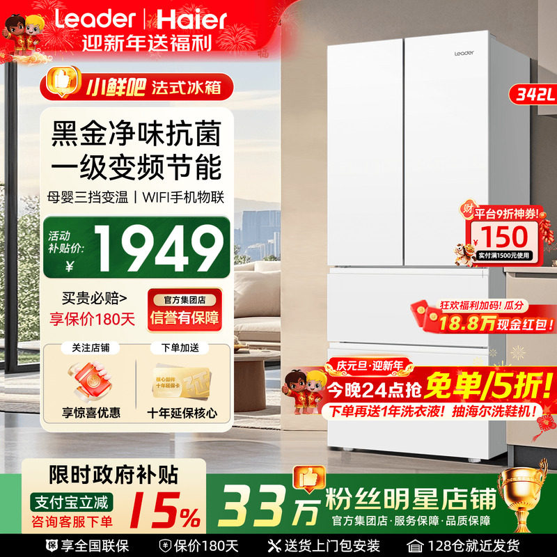国补15%]海尔电冰箱342L家用法式四开门统帅一级能效变频无霜旗舰
