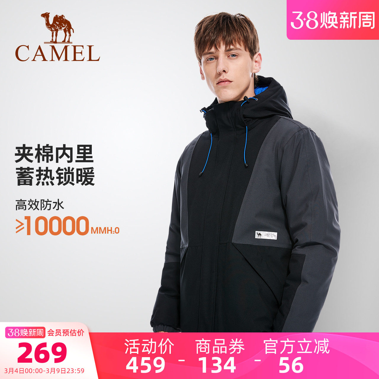 骆驼男装连帽棉衣官方冬季户外加厚夹棉冲锋衣外套防风防水棉袄男