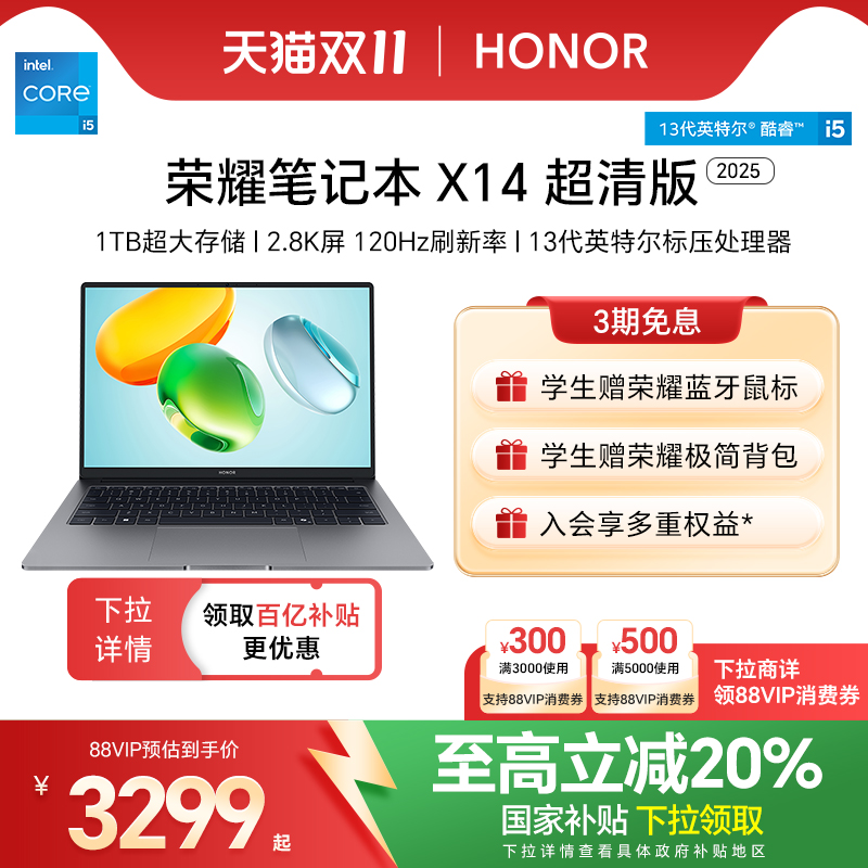 【政府补贴20%】荣耀笔记本X14 超清版13代酷睿标压处理器2.8K 120H