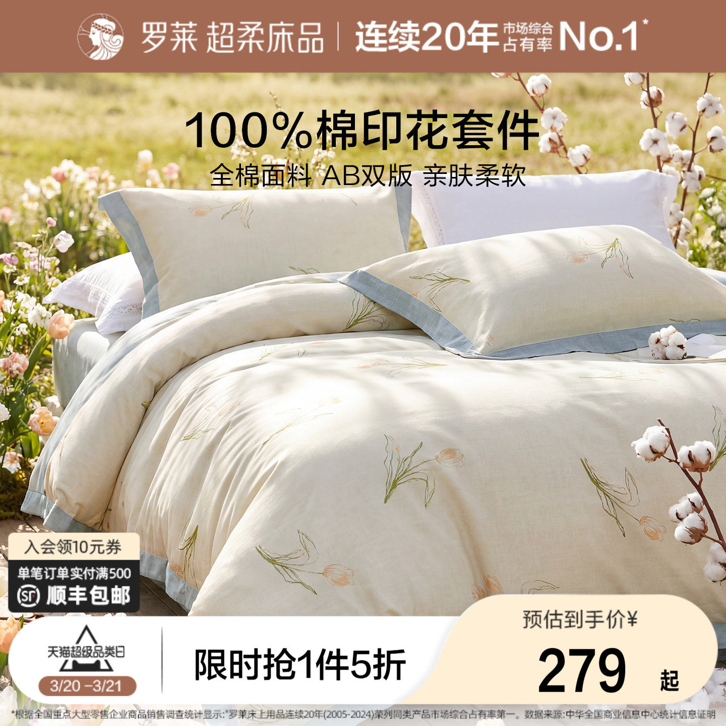 罗莱家纺床上四件套全棉纯棉被套床单棉双人套件宿舍三件套