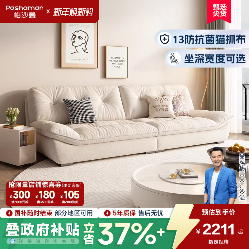 帕沙曼云朵沙发客厅现代简约小户型直排奶油风布艺沙发猫抓布抗菌