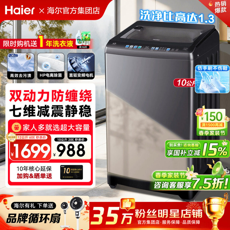 海尔洗衣机双动力防缠绕60E家用全自动10kg直驱变频50E手搓洗波轮