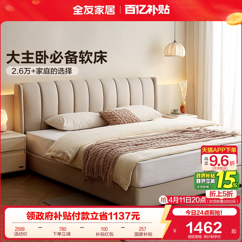 全友家居奶油风琴键双人大床主卧室软包床科技布艺高箱储物落地床