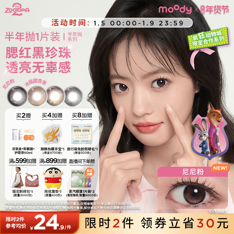 4H秒杀moody美瞳半年抛疯狂动物城2尼尼粉色彩色隐形眼镜官方1片