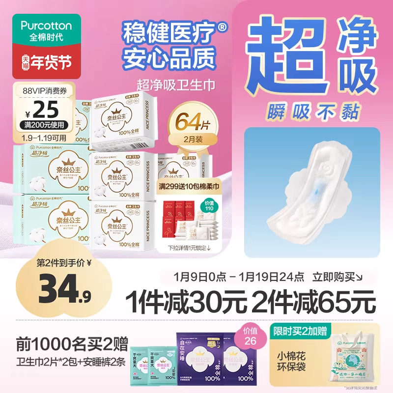 优于新国标 全棉时代奈丝公主纯棉卫生巾超薄日夜组合2月装64片