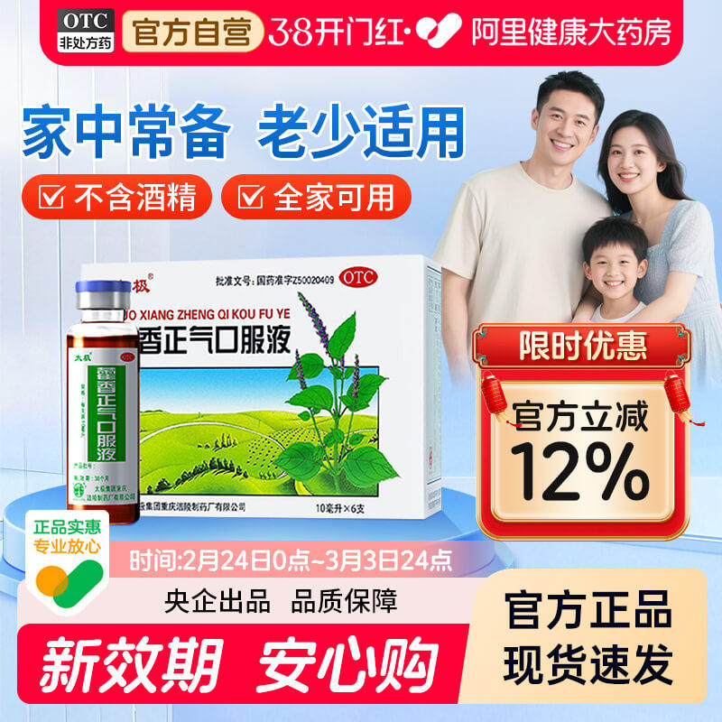 太极藿香正气口服液正品无酒精理气中和祛湿止呕头晕肠胃不适