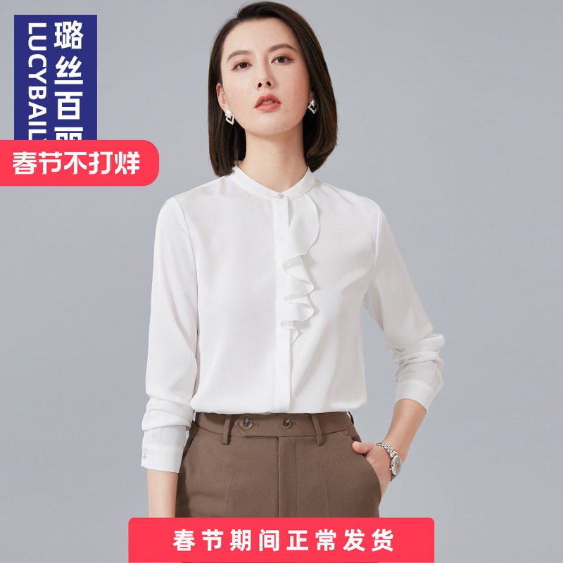• 泡美丽»»白色立领雪纺荷叶边衬衫女长袖春秋法式职业时尚洋气衬衣上衣