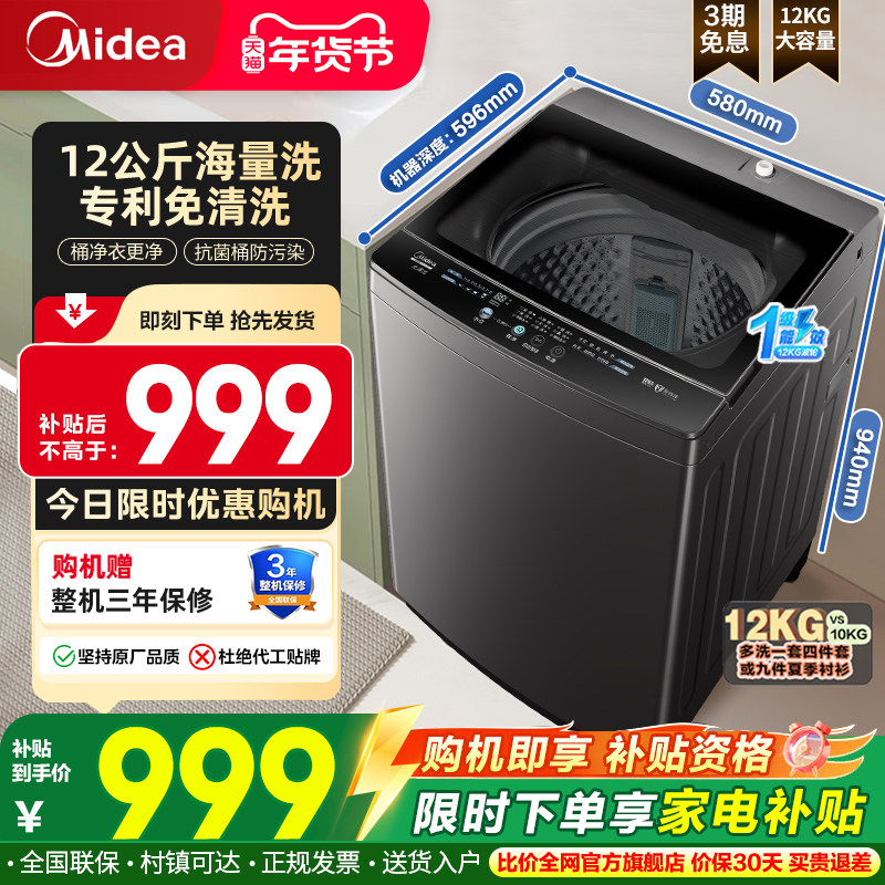 全民补贴美的波轮洗衣机12KG家用租房除螨抗菌全自动洗脱一体