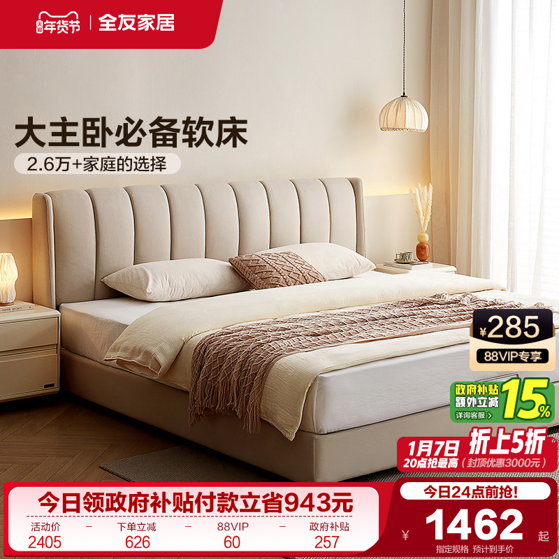 全友家居奶油风琴键双人大床主卧室软包床科技布艺高箱储物落地床