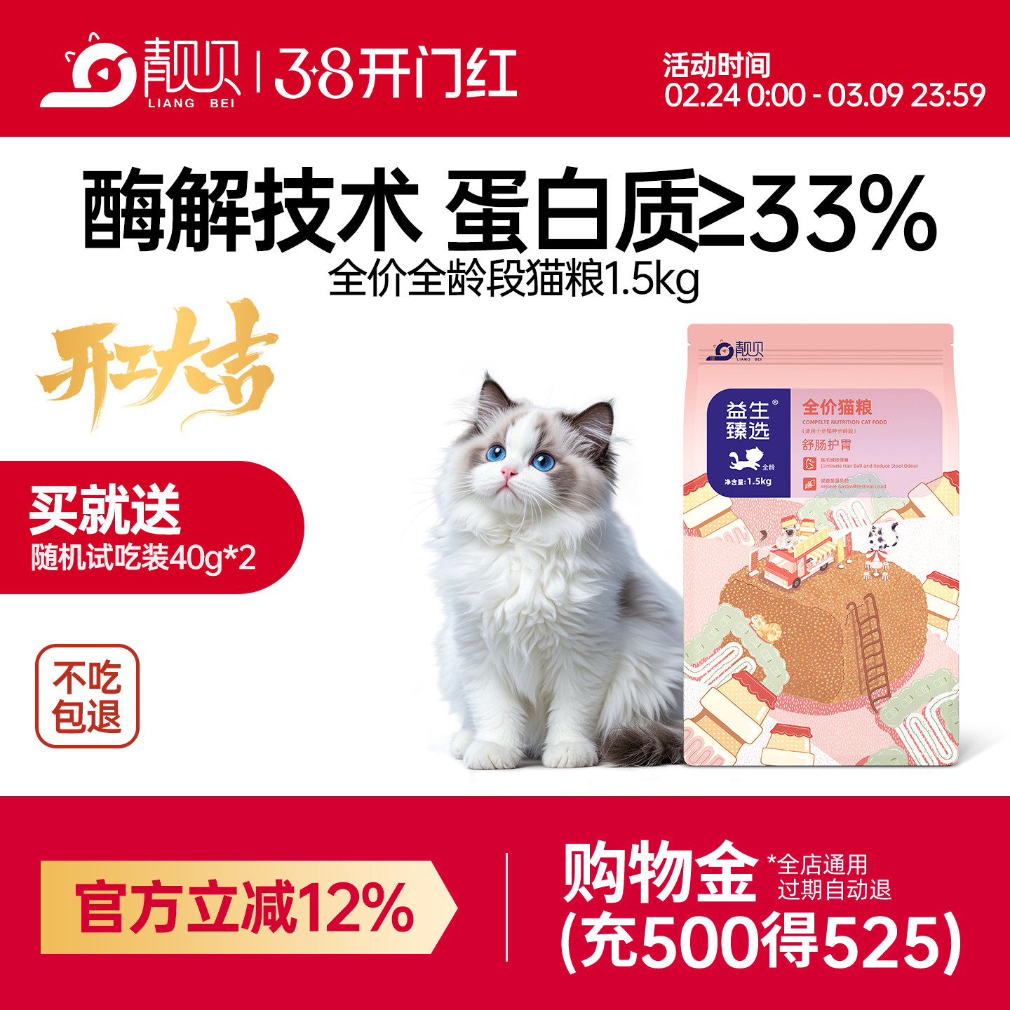 靓贝猫粮1.5kg肠胃通用全阶段益生臻选猫粮英短布偶成幼全价猫粮
