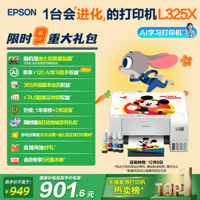 【政府补贴】爱普生L3251/L3253迪士尼系列墨仓式打印机彩色无线WIFI复