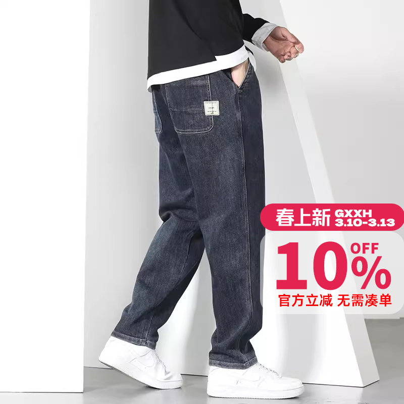 GxxH大码潮牌男装 加肥加大号秋季个性宽松深蓝色牛仔直筒长裤