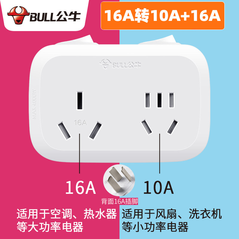 公牛插座转换器16a10a插座转换头一分二插头插排插大功率空调专用