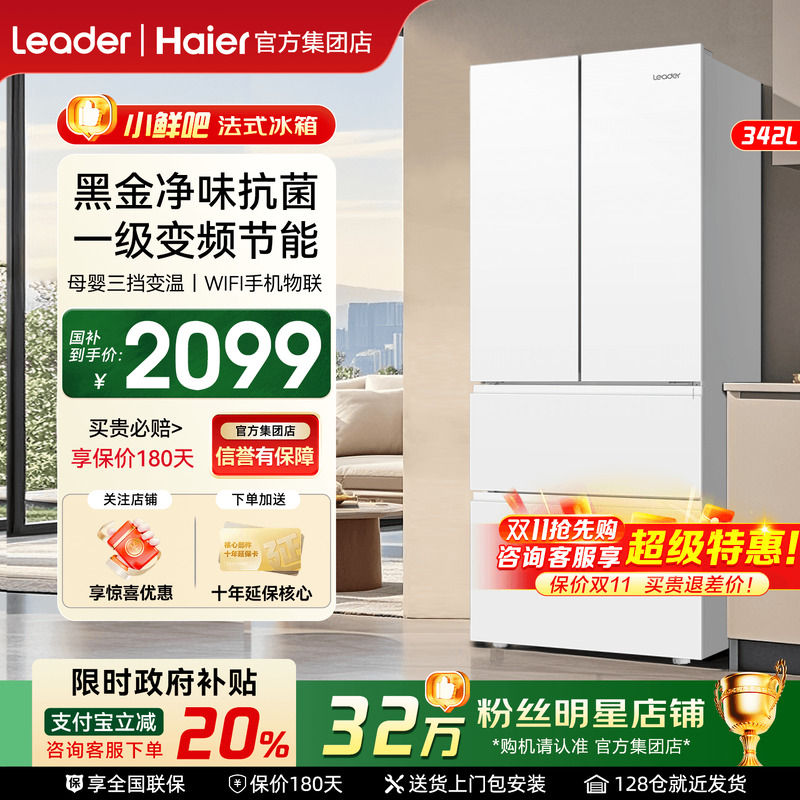 国补20%]海尔电冰箱342L家用法式四开门统帅一级能效变频无霜旗舰