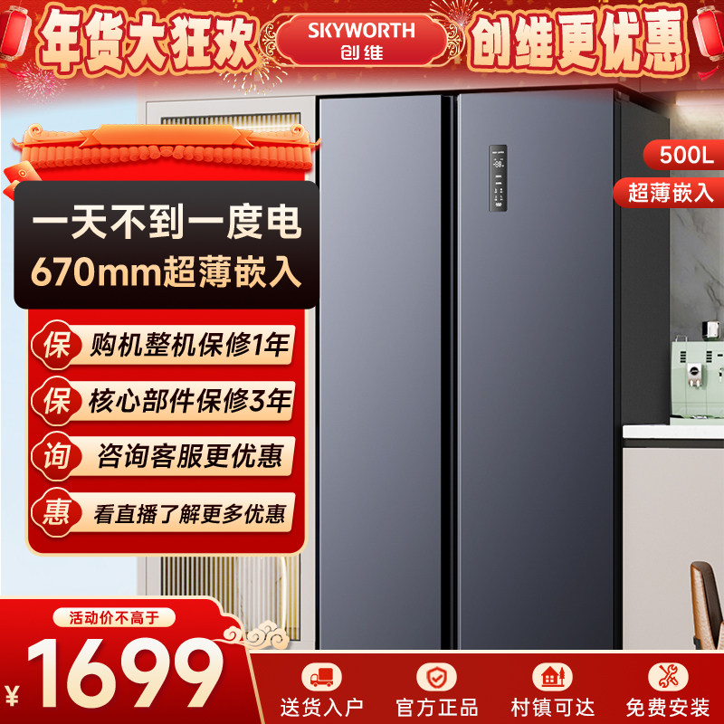 创维冰箱500升家用双开门大容量一级能效嵌入式超薄节能风冷无霜
