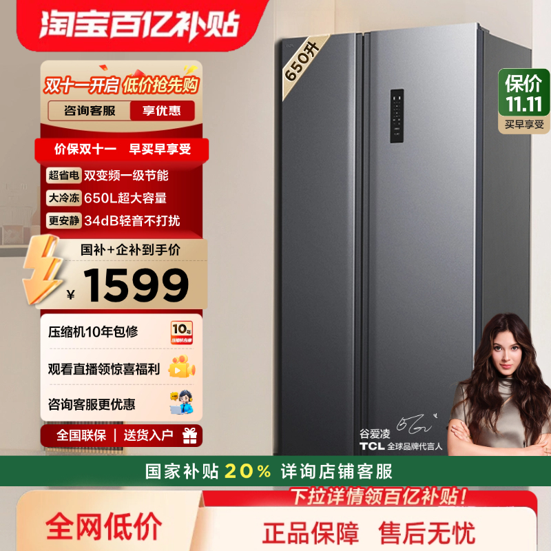 TCL 650升对开门双开门大容量大冷冻冰箱 一级能效 风冷无霜变频