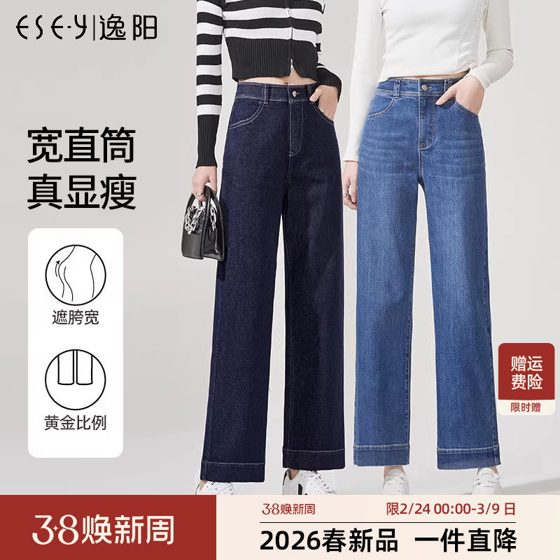 逸阳女裤2026春季新款韩版高腰大码宽松舒适直筒裤九分阔腿牛仔裤