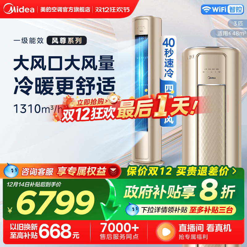 美的空调3匹智能变频一级能效立式柜机客厅家用节能冷暖两用风尊