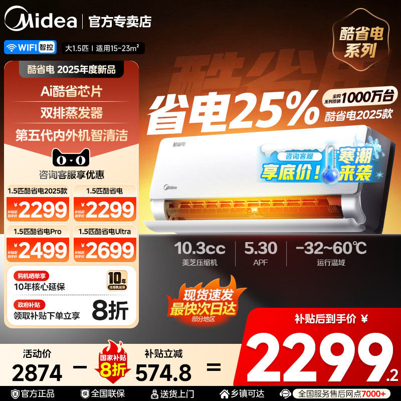 美的空调官方正品酷省电2025版一级家用大1.5匹2匹变频冷暖挂机