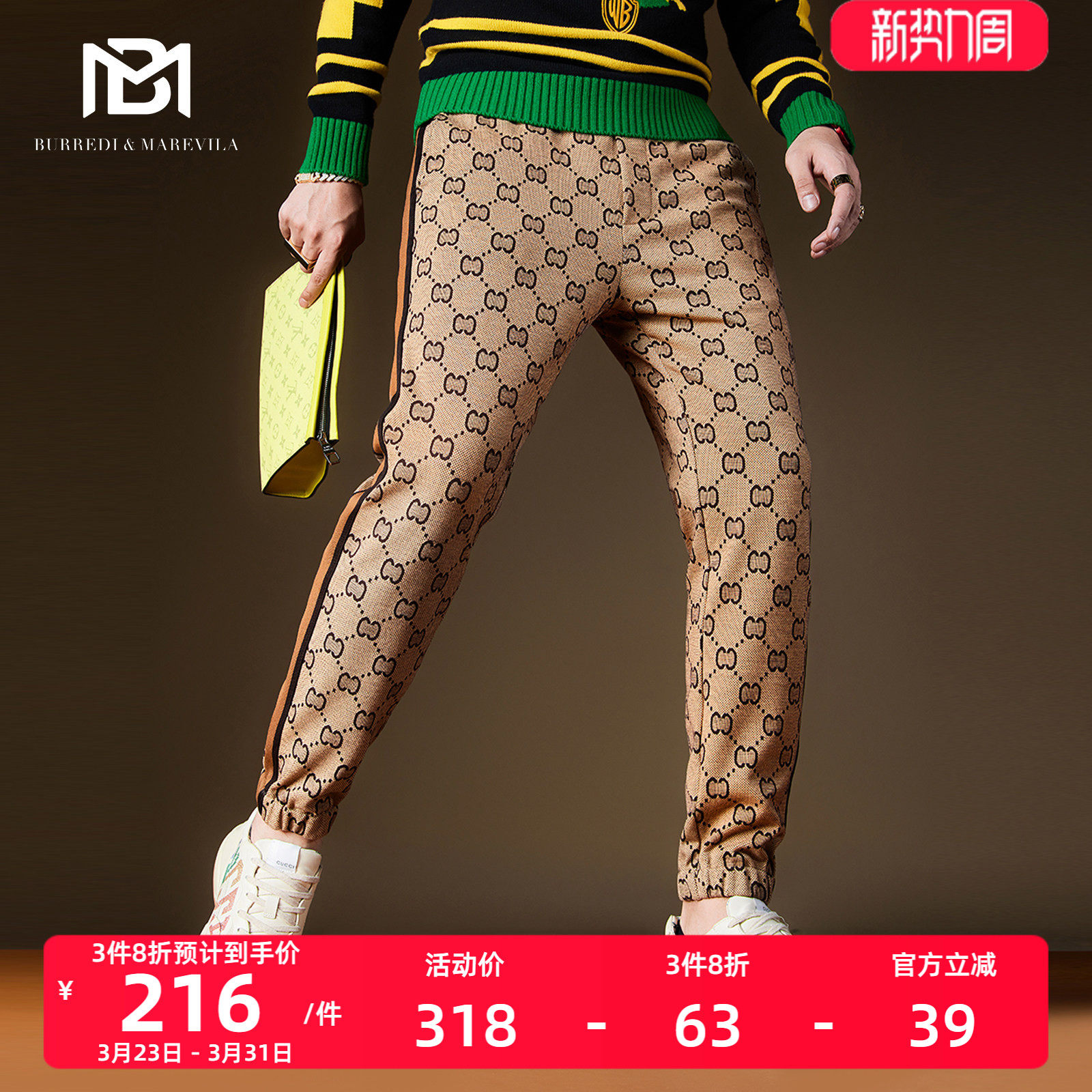 BM男士休闲裤秋冬款2022欧货新款男裤子高街满花潮牌束脚重磅卫裤