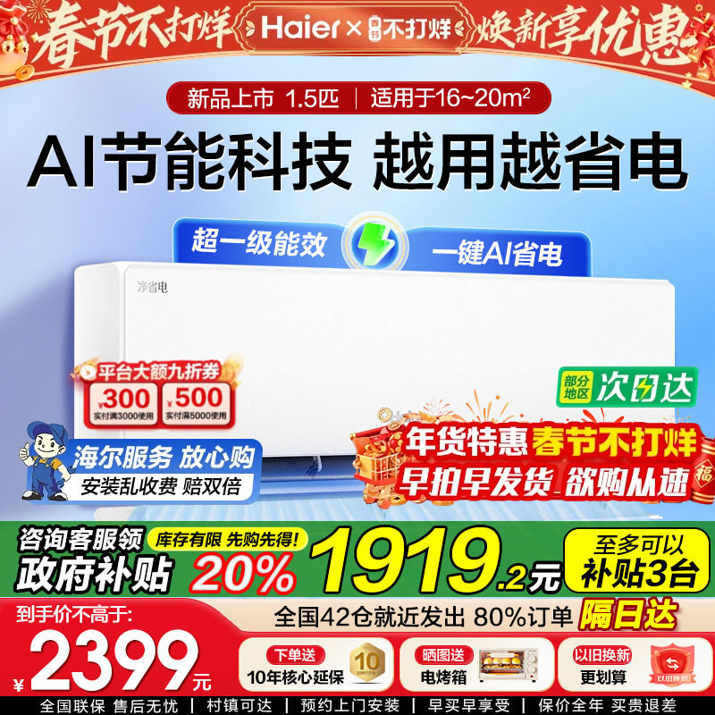 [政府补贴]海尔空调大1.5匹2匹一级能效变频家用卧室客厅挂机省电