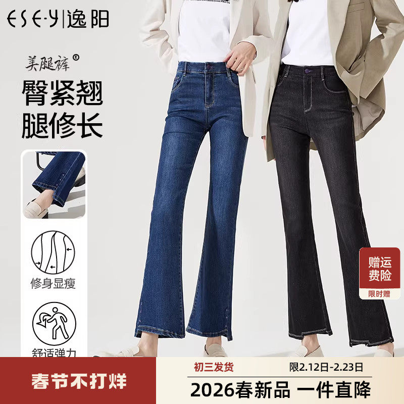 逸阳2026春季高腰微喇显瘦牛仔裤女九分小喇叭毛边不规则阔腿长裤