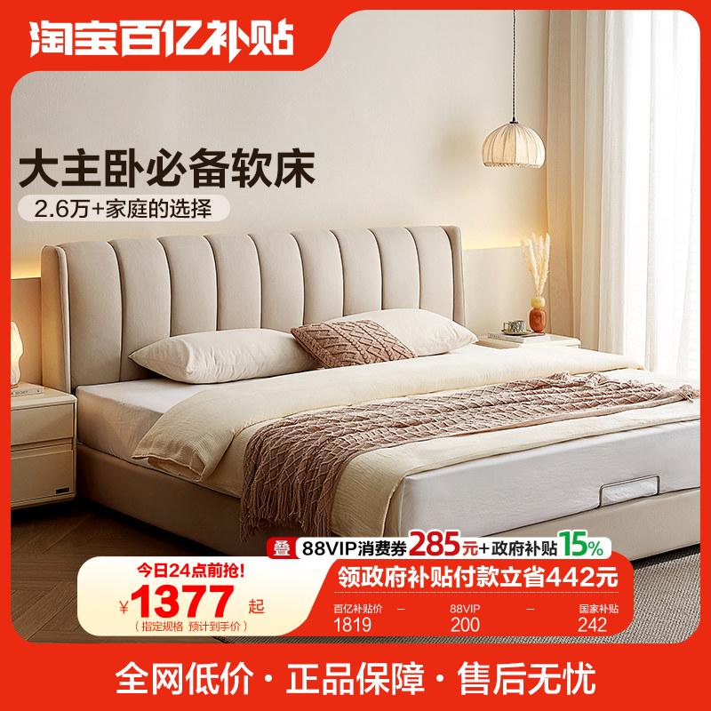全友家居奶油风琴键双人大床主卧室软包床科技布艺高箱储物落地床