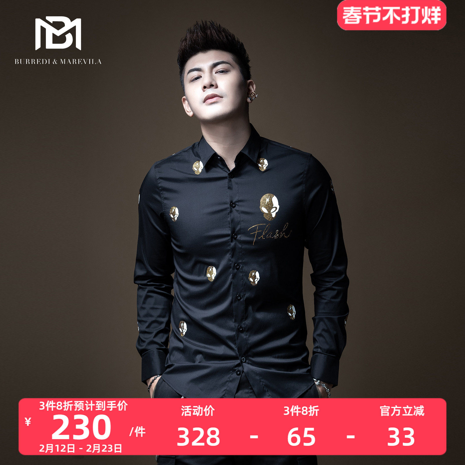BM男士外星人烫钻痞帅花衬衫男长袖英伦潮牌港风潮流韩版帅气修身