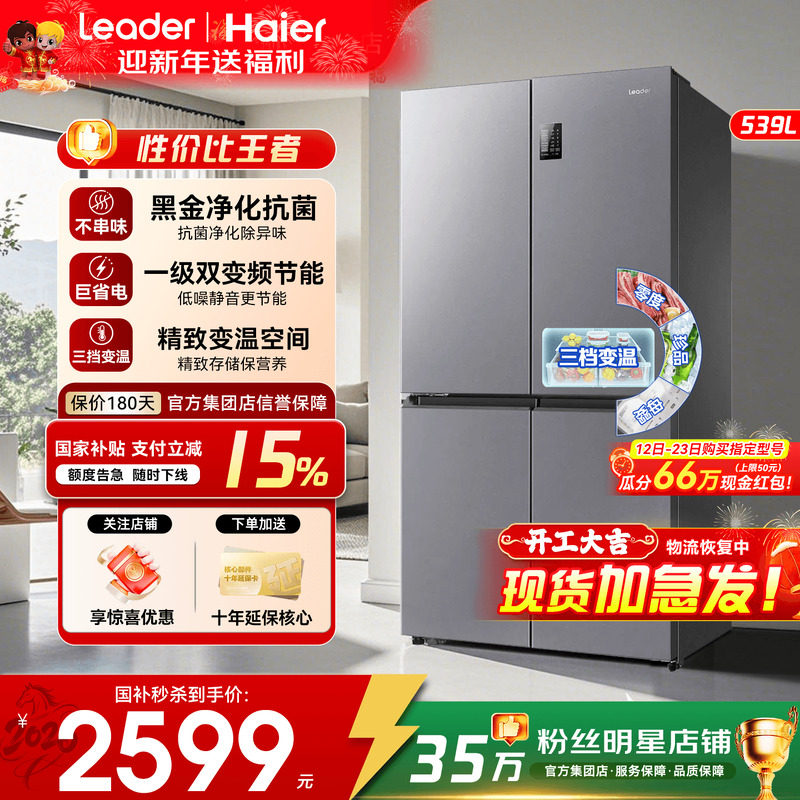 • 泡美丽»»国补15%]海尔冰箱539L升超大容量统帅家用一级变频十字四门旗舰店