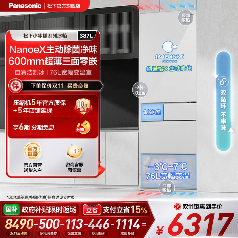 【小冰糕系列】松下387L法式多门零嵌冰箱制冰纳诺怡除菌 EE40TXB