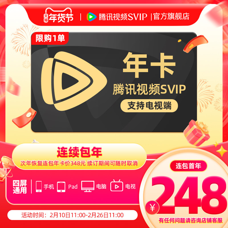 【2月10日抢首年248元】腾讯视频SVIP会员年卡极光TV一年会员