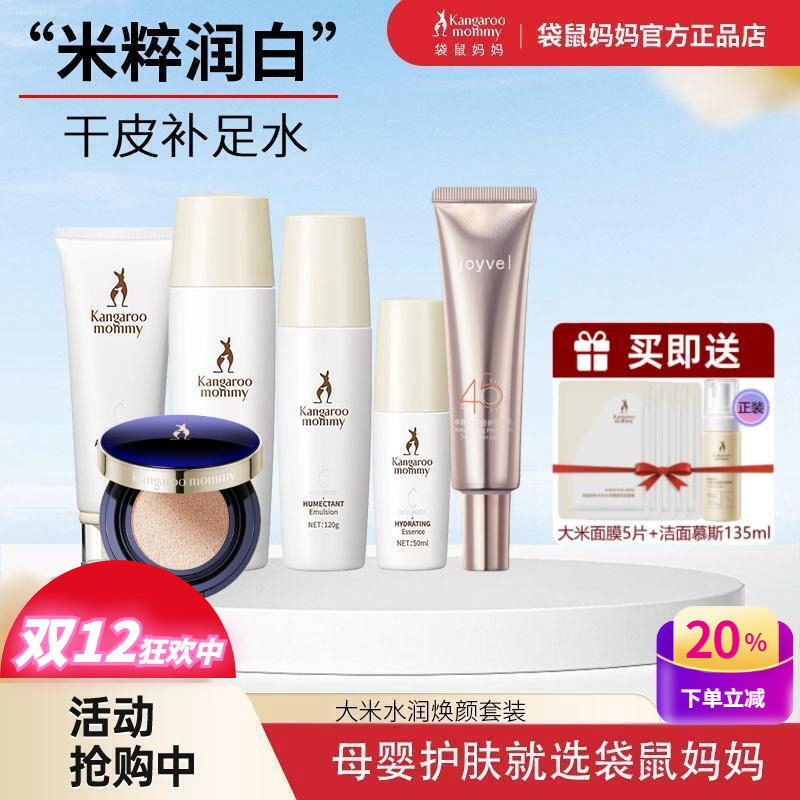 袋鼠妈妈孕妇期护肤品天然去黄保湿气垫化妆品大米洁面补水乳套装