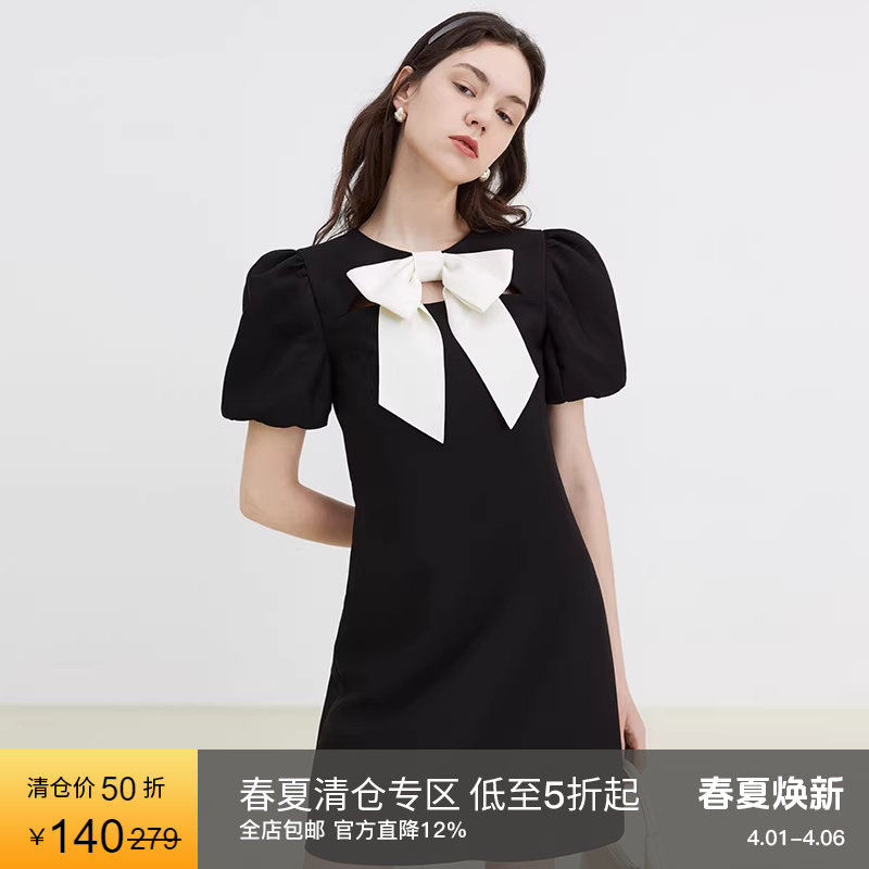 范洛2026夏季新款黑色蝴蝶结连衣裙女法式复古泡泡袖设计感A字裙
