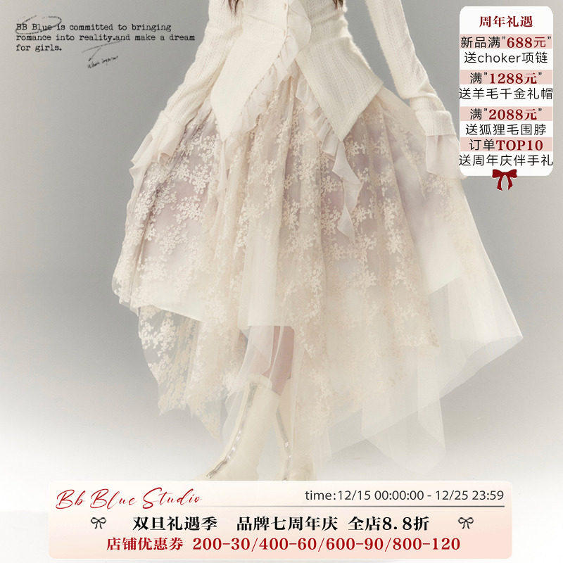BB BLUE 原创设计 高腰a字碎花半身裙女秋冬小众不规则长纱裙子