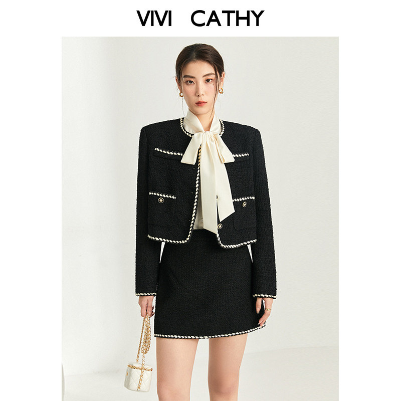 vivicathy2025年初新款小香风外套黑色复古港风高级感短款外套