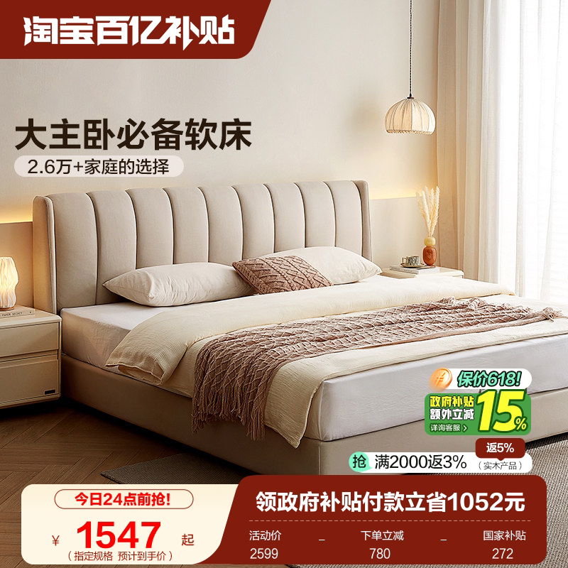 全友家居奶油风琴键双人大床主卧室软包床科技布艺高箱储物落地床
