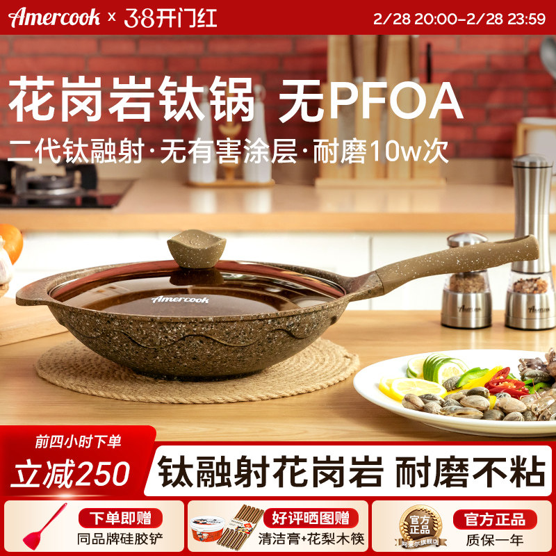 amercook阿尔菲塔麦饭石花岗岩钛炒锅不粘锅家用炒菜锅燃气电磁炉