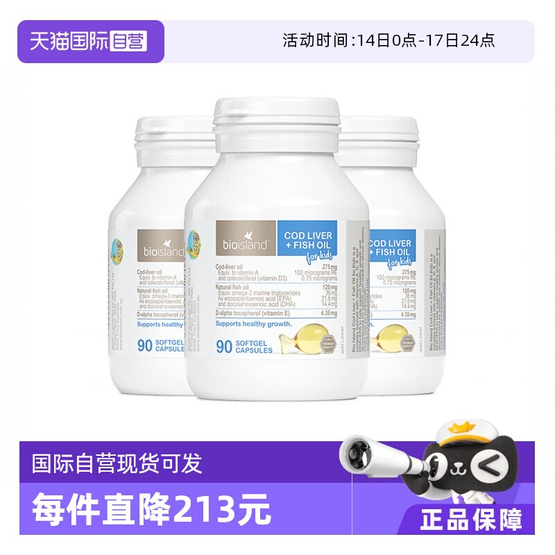 【自营】bioisland佰澳朗德深海鱼肝油胶囊DHA儿童宝宝90粒*3瓶