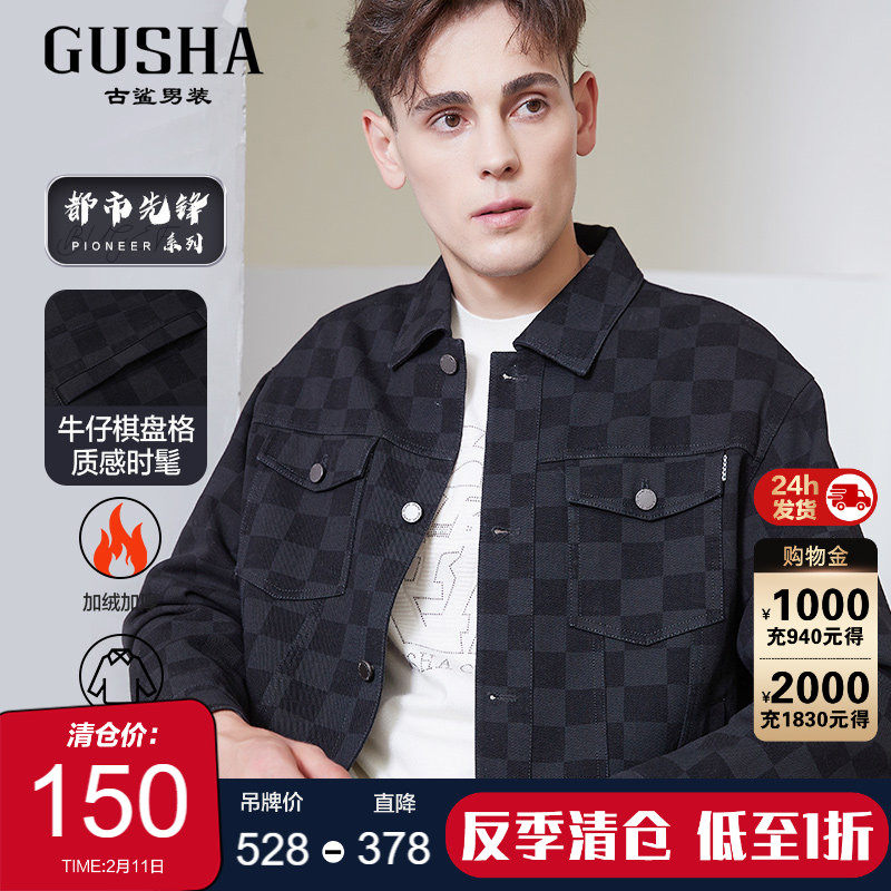 【棋盘格/阔版】古鲨黑色格子牛仔外套男潮流宽松时尚夹克2025冬