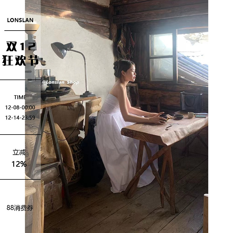 Lonslan 2023早春新品纯欲风简约质感收腰白色抹胸连衣裙美到发光