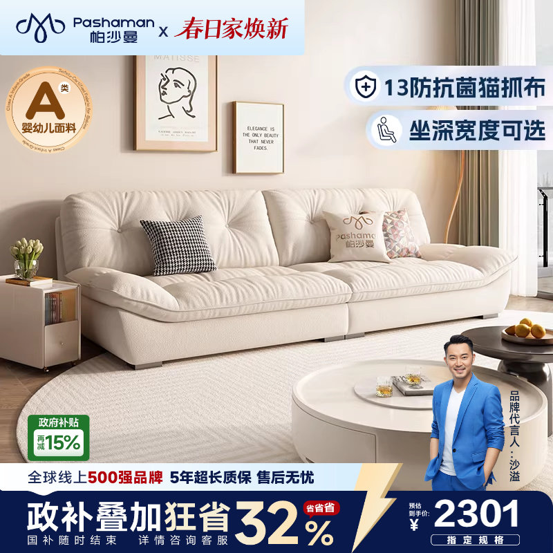 帕沙曼云朵沙发客厅现代简约小户型直排奶油风布艺沙发猫抓布抗菌