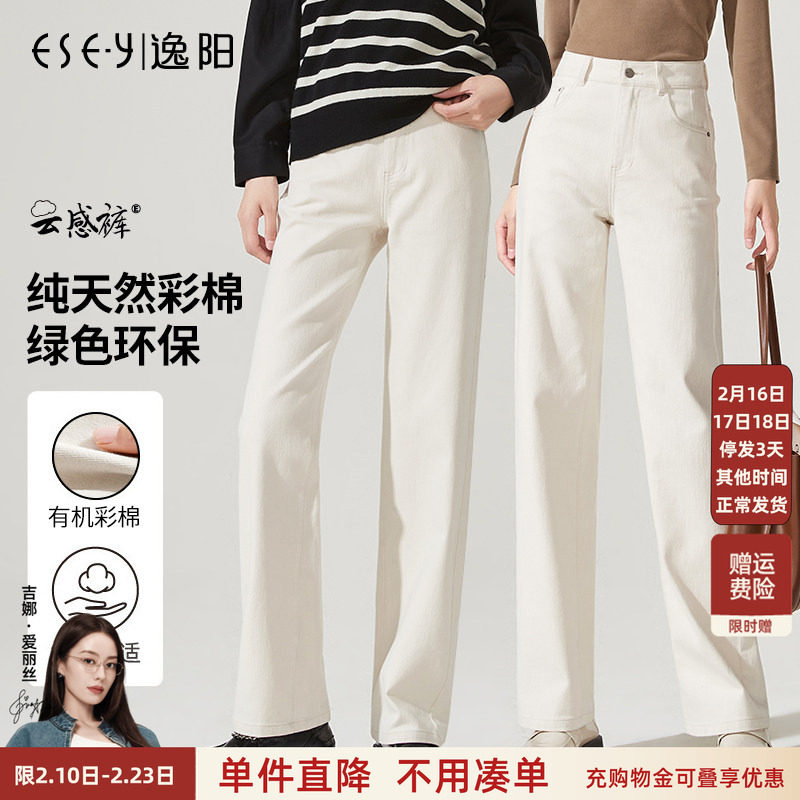 逸阳米色窄版阔腿牛仔裤女秋冬加绒米白色高腰遮肉显瘦加厚直筒裤