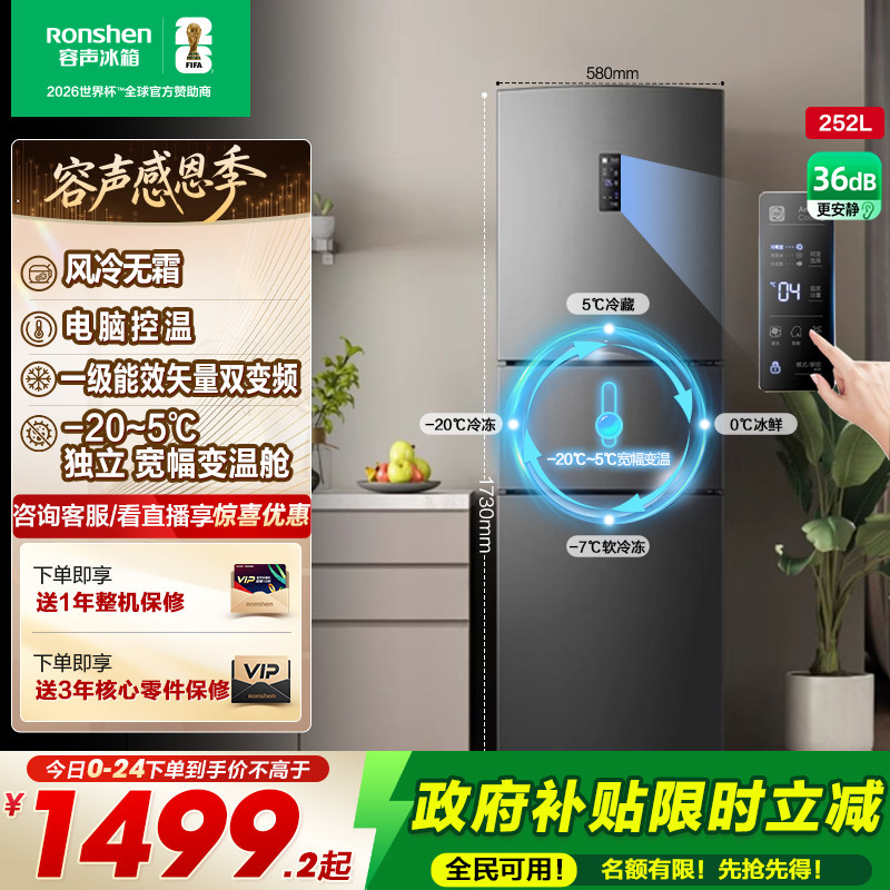 容声252/253L一级能效三开门变频无霜家用小型租房电冰箱官方补贴
