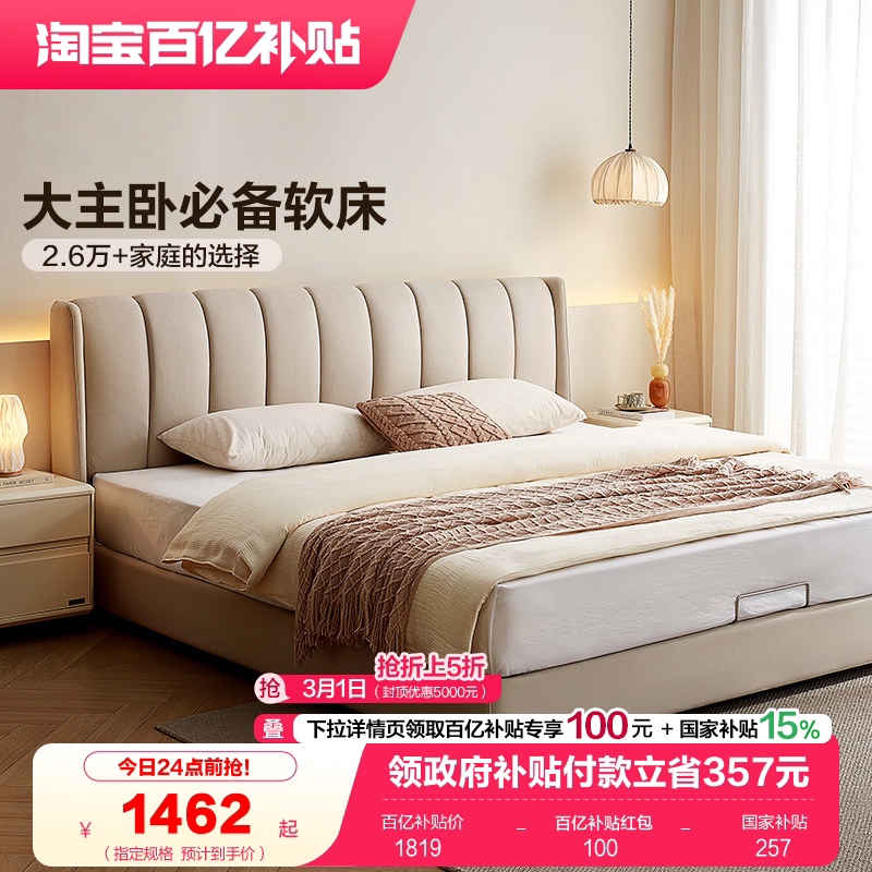 • 泡美丽»»全友家居奶油风琴键双人大床主卧室软包床科技布艺高箱储物落地床