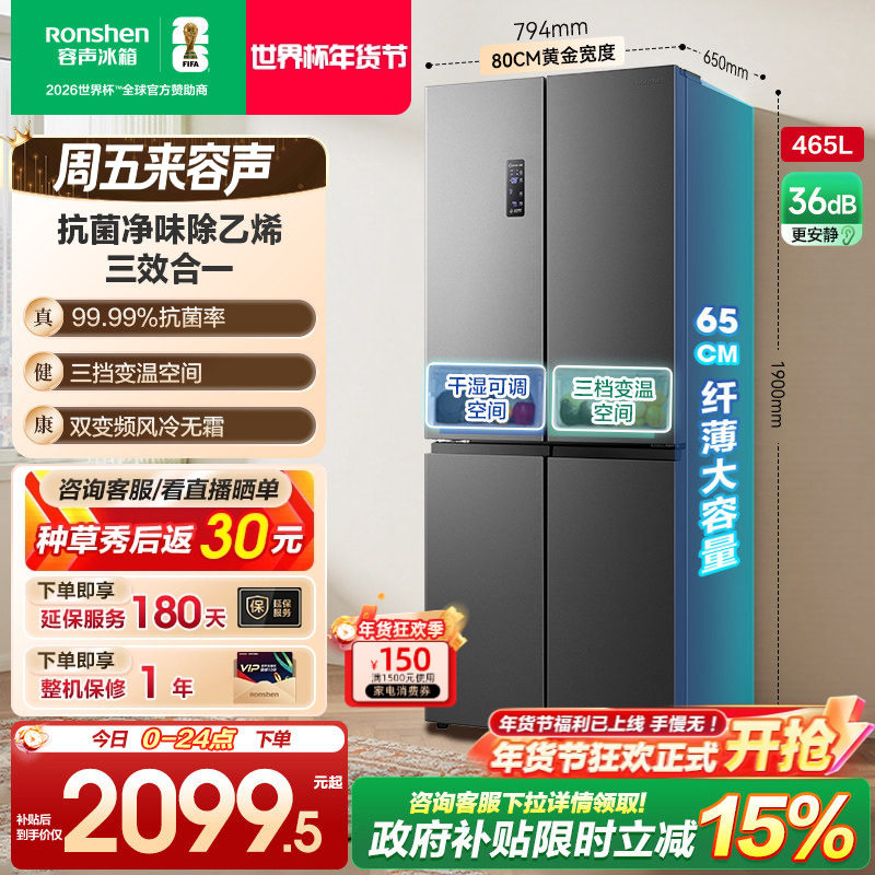 容声465L十字双开四门大容量一级风冷无霜薄嵌入家用冰箱换新补贴