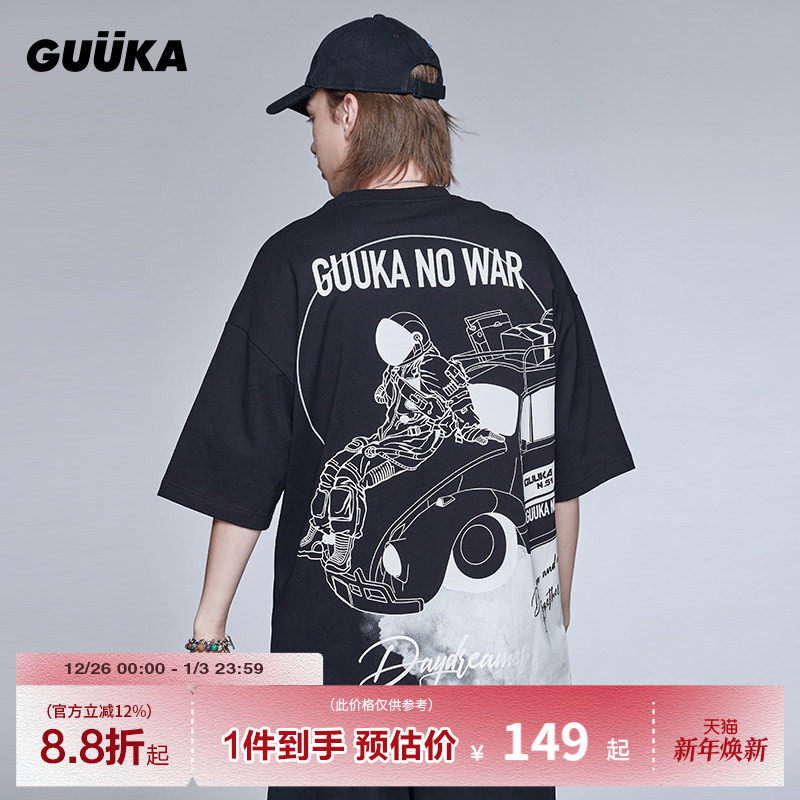 • 泡美丽»»GUUKA潮牌黑色短袖T恤男夏情侣嘻哈后背宇航员印花运动五分袖宽松